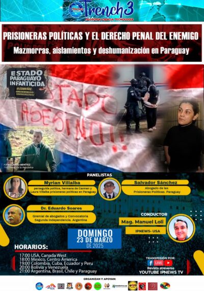 En esta edición de TRENCH3, abordamos un tema crucial para los luchadores sociales y los prisioneros políticos y de guerra revolucionarios en el mundo. Analizamos cómo el Estado paraguayo aplica la doctrina fascista del “Derecho Penal del Enemigo”, utilizada para justificar la tortura y los crímenes de Estado contra quienes se oponen al sistema capitalista en su fase imperialista.